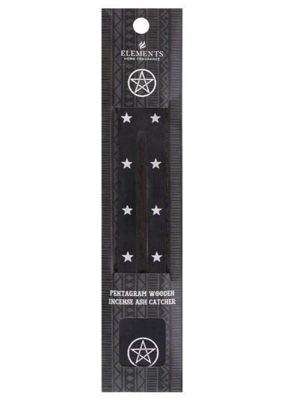 This gothic take on a traditional incense stick ash catcher is made from mango wood, painted black and features a printed pentagram symbol accented by silver stars.