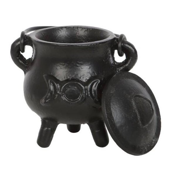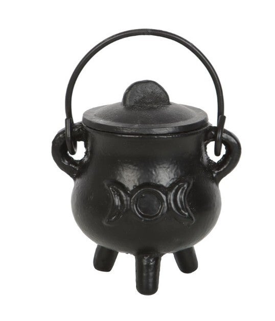 A small sized cast iron cauldron with triple moon design in a smooth finish. Add to an altar space for use during rituals and spell work. Also perfect for making moon water, scrying, combining herbs and more. Measures 7.5cm tall, not including handle. Not suitable for use with tall candles or food items. Caution: cauldron will get hot when used with a heat source. Please handle with care and always place on a heat resistant surface.