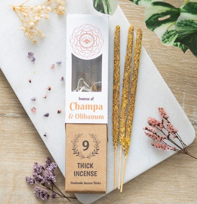 These Champa & Olibanum (frankincense) Botanical Incense Sticks from Green Tree have been handcrafted to cleanse and purify surroundings while balancing the mind and soul. Each inner pack includes 9 large incense sticks to use during yoga, meditation and spiritual rituals. Each box contains 6 packs of incense sticks that are great for gifting. Cruelty-free.