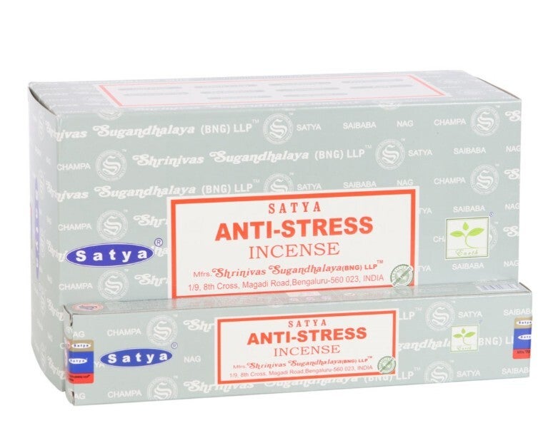 This box contains 12 packs of Anti-Stress incense sticks from Satya's Mindfulness Series of masala incense. This relaxing lavender and vanilla scent is ideal for attracting peace and clarity in the body and soul. Satya incense are handmade by artisans in India using the highest quality ingredients. Each inner pack contains 15g of vegan friendly incense sticks.