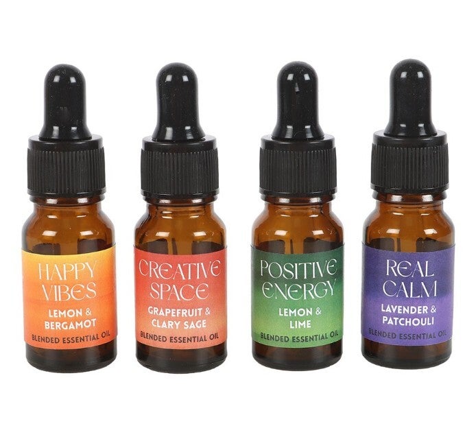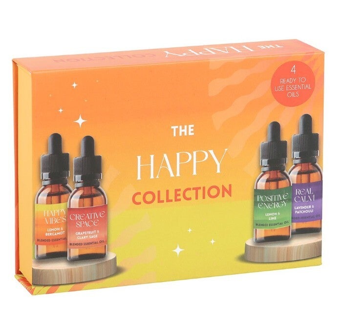 Happiness- Reset yourself with this Happy collection of ready to use, blended essential oils. The set contains 4 x 10ml bottles with a dropper tool lid, helping to apply just the right amount of oil for each use. The scents you'll discover in this set are: Happy Vibes - Lemon & Bergamot, Creative Space - Grapefruit & Clary Sage, Positive Energy - Lemon & Lime, Real Calm - Lavender & Patchouli. Natural essential oils pre-diluted with vitis vinifera seed (grape seed) oil.
