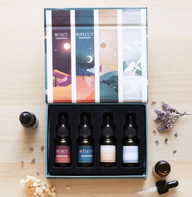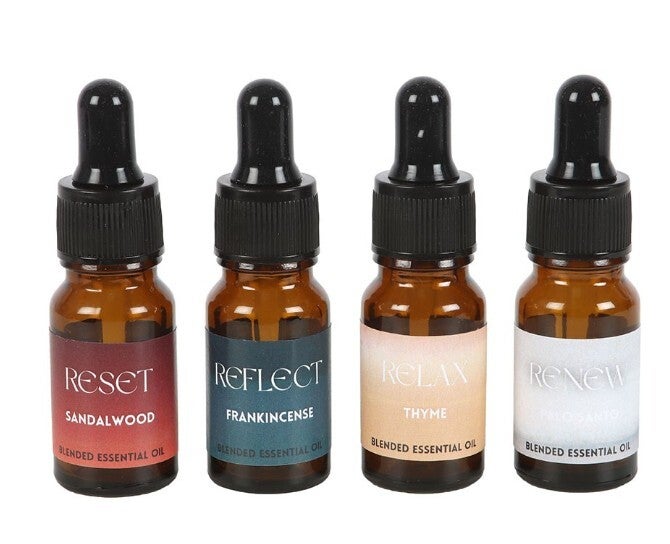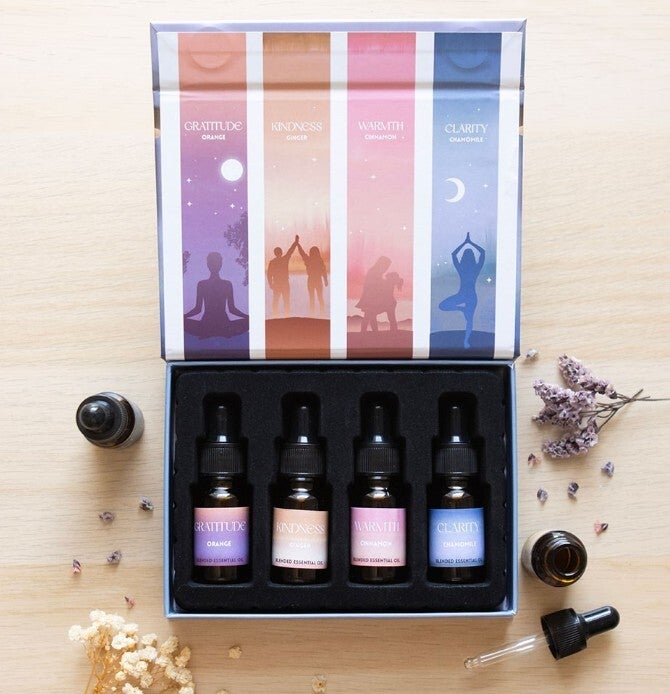 Mindfullness- Pause and reset with this Mindfulness collection of ready to use, blended essential oils. The set contains 4 x 10ml bottles with a dropper tool lid, helping to apply just the right amount of oil for each use. The scents you'll discover in this set are: Gratitude - Orange, Kindness - Ginger, Warmth - Cinnamon, Clarity - Chamomile. Natural essential oils pre-diluted with vitis vinifera seed (grape seed) oil.