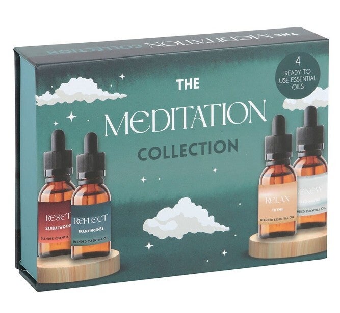 Meditate- Pause and reset with this Meditation collection of ready to use, blended essential oils. The set contains 4 x 10ml bottles with a dropper tool lid, helping to apply just the right amount of oil for each use. The scents you'll discover in this set are: Reset - Sandalwood, Reflect - Sandalwood, Relax - Thyme, Renew - Palo Santo. Natural essential oils pre-diluted with vitis vinifera seed (grape seed) oil.