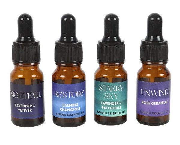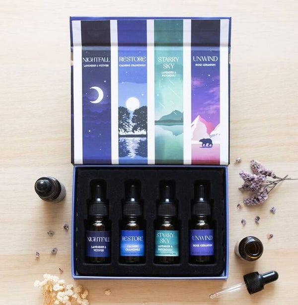 Sleep- Unwind and relax with this Sleep collection of ready to use, blended essential oils. The set contains 4 x 10ml bottles with a dropper tool lid, helping to apply just the right amount of oil for each use. The scents you'll discover in this set are: Nightfall - Lavender & Vertiver, Restore - Calming Chamomile, Starry Sky - Lavender & Patchouli, Unwind - Rose Geranium. Natural essential oils pre-diluted with vitis vinifera seed (grape seed) oil.