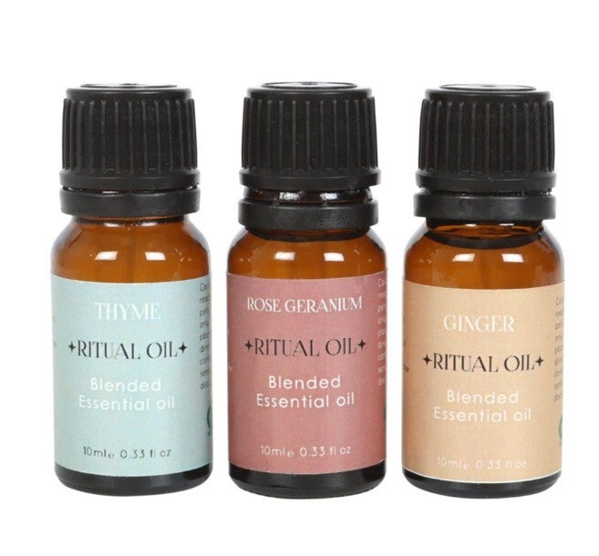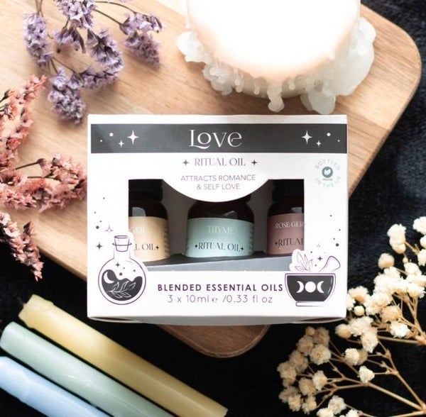 Love- Create an atmosphere of love, connection, and blissful serenity with this Set of 3 Love Ritual Blended Essential Oils. Crafted with a natural and harmonious blend of Thyme, Rose Geranium and Ginger, these essential oils carry properties of romance and intimacy. Dab essential oil on pulse points, close eyes, breathe deeply and read the Love ritual aloud. Alternatively, add a few drops in an oil burner or diffuser, or add to bathwater to fill surroundings with sweet fragrance. All bottles are 10ml.