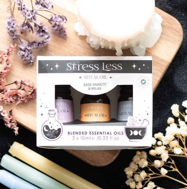 Stress Relief- Create an atmosphere of relaxation, calmness, and blissful serenity with this Set of 3 Stress Less Ritual Blended Essential Oils. Crafted with a natural and harmonious blend of Orange, Lavender and Patchouli, these essential oils carry detoxifying properties and banishes negative energy. Dab essential oil on pulse points, close eyes, breathe deeply and read the Stress Less ritual aloud. Alternatively, add a few drops in an oil burner or diffuser, or add to bathwater to fill surroundings with beautiful fragrance. All bottles are 10ml.