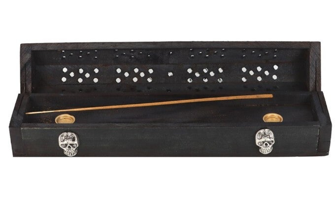 Ward off the undead with this Run Away Vampire incense box set. Includes 10 sandalwood-scented incense sticks, providing a warm and earthy fragrance for keeping vampires at bay. Accented with silver skulls, the black, wooden box can do more than just hold incense sticks- it also supports incense cones and has a secret incense storage compartment.