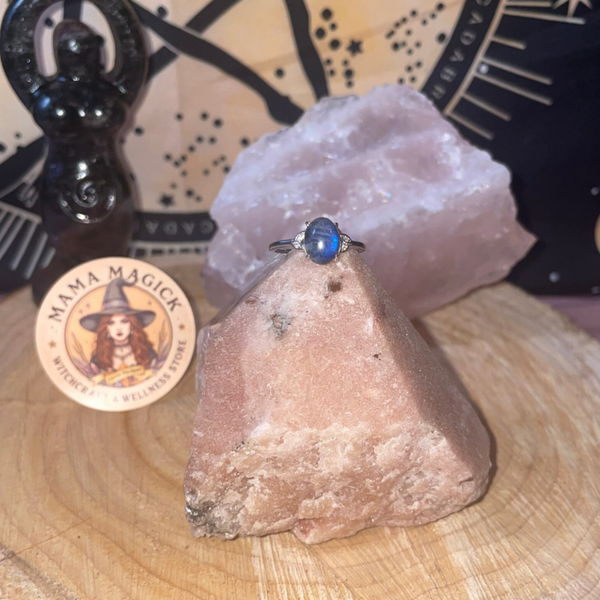 This sterling silver adjustable ring showcases a striking labradorite, carved into a sleek, eye-catching shape, with flashes of deep midnight blue shimmering across its surface like moonlight on dark water. Known as a stone of protection and intuition, labradorite is believed to enhance spiritual insight, awaken inner magic, and shield against negative energies. Mysterious, luminous, and endlessly captivating, this ring is a powerful talisman that combines elegance with the mystical allure of the night sky.