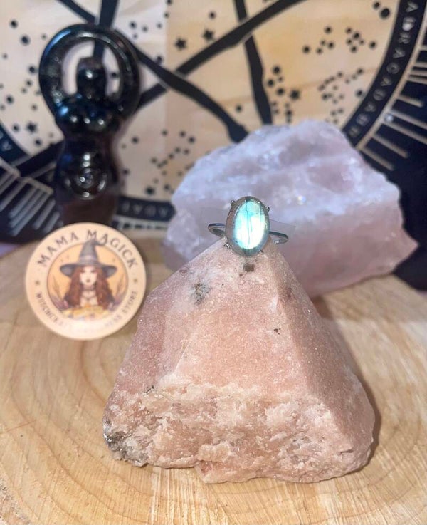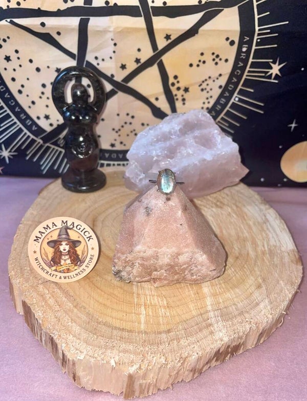 This sterling silver adjustable ring showcases a stunning large oval Labradorite, its surface alive with iridescent flashes of blue, green, and gold that shift with every movement. Renowned as a stone of protection and intuition, Labradorite is believed to enhance spiritual awareness, strengthen inner guidance, and shield against negative energies. Bold, mystical, and captivating, this ring makes a striking statement while serving as a powerful talisman for clarity, transformation, and magical energy.