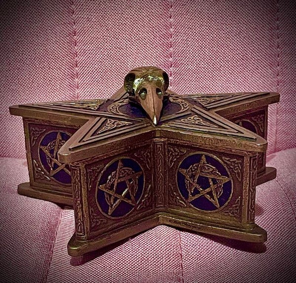 This gorgeous pentagram/ star shaped trucker box features a gorgeous raven's skull on top with lots of pagan, spiritual symbols and etchings. This box is perfect for trinkets, jewellery and other items.