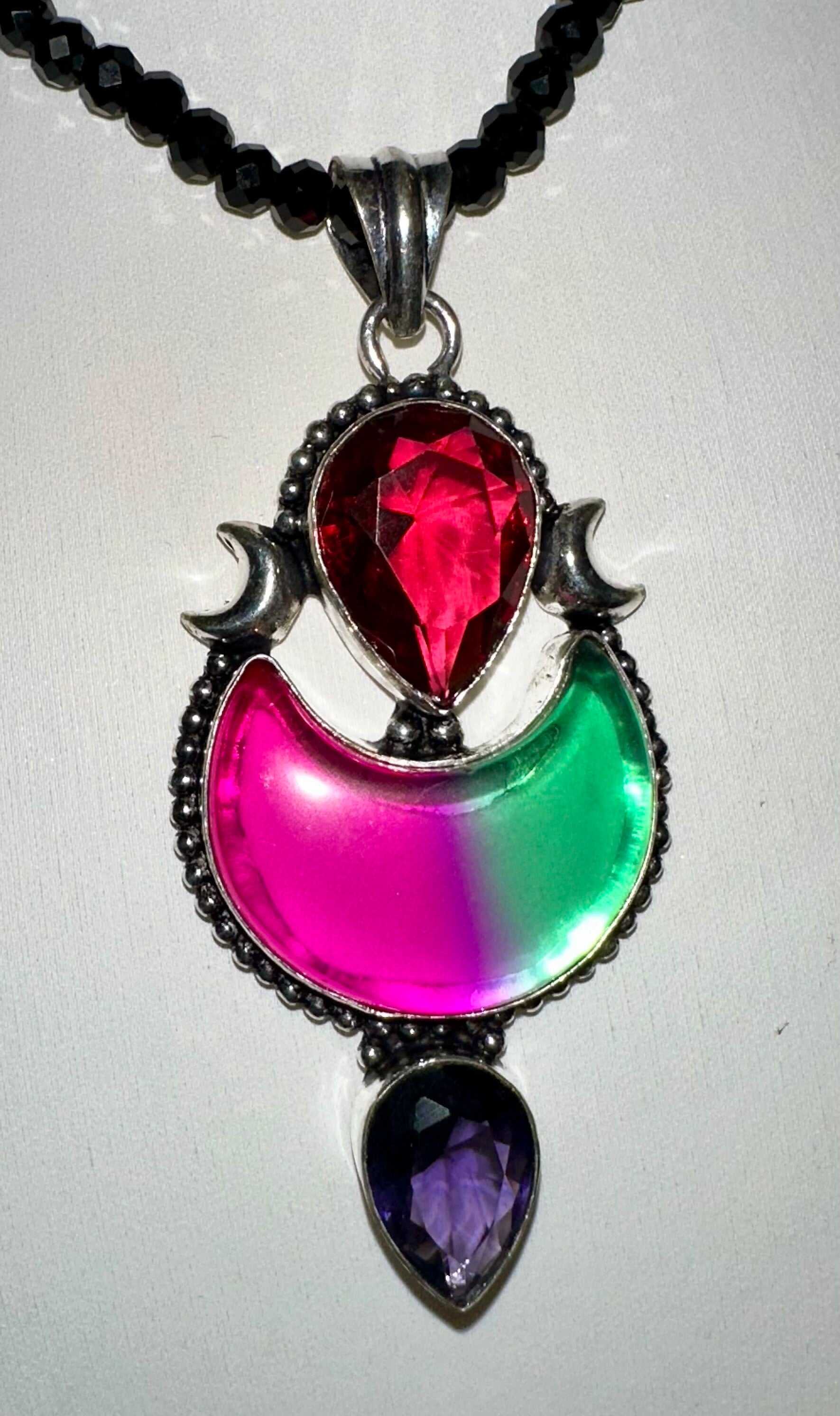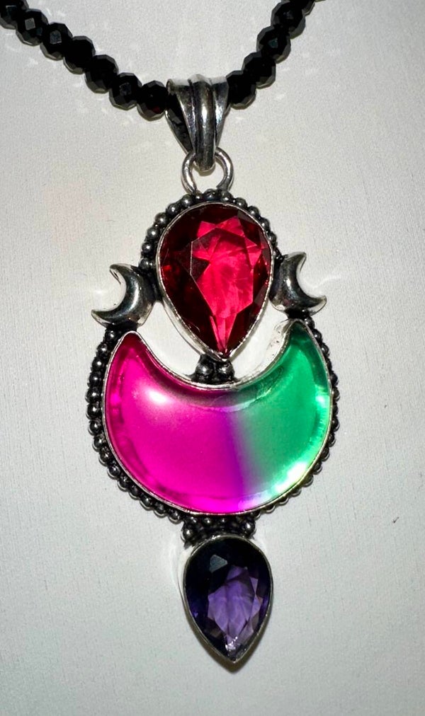 This gorgeous silver pendant is in the design of a goddess body and triple moon with garnet, bi colour tourmaline and amethyst crystals. This is a pendant only but will fit all the normal size chokers in our collection (excluding the XL & XXL size chokers) or can be worn on another necklace.