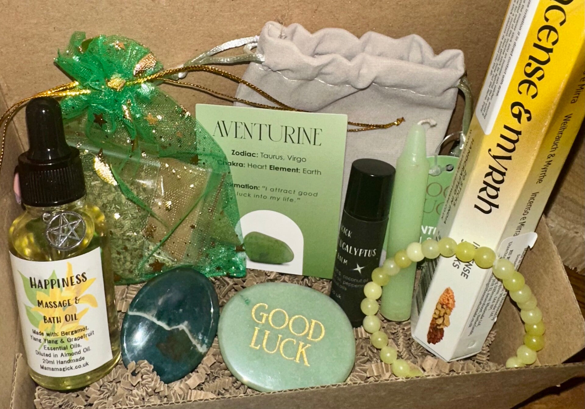 This box is filled with good luck energy and lucky manifestation power. Containing 4 mini bags of good luck and prosperity herbs for spell work, green candle, a moss agate worry stone, a lemon jade lucky bracelet, a peppermint lip balm for speaking your wishes into existence, a good luck embossed green aventurine palm stone, full size happiness oil and a full size box of frankincense and myrrh incense sticks!